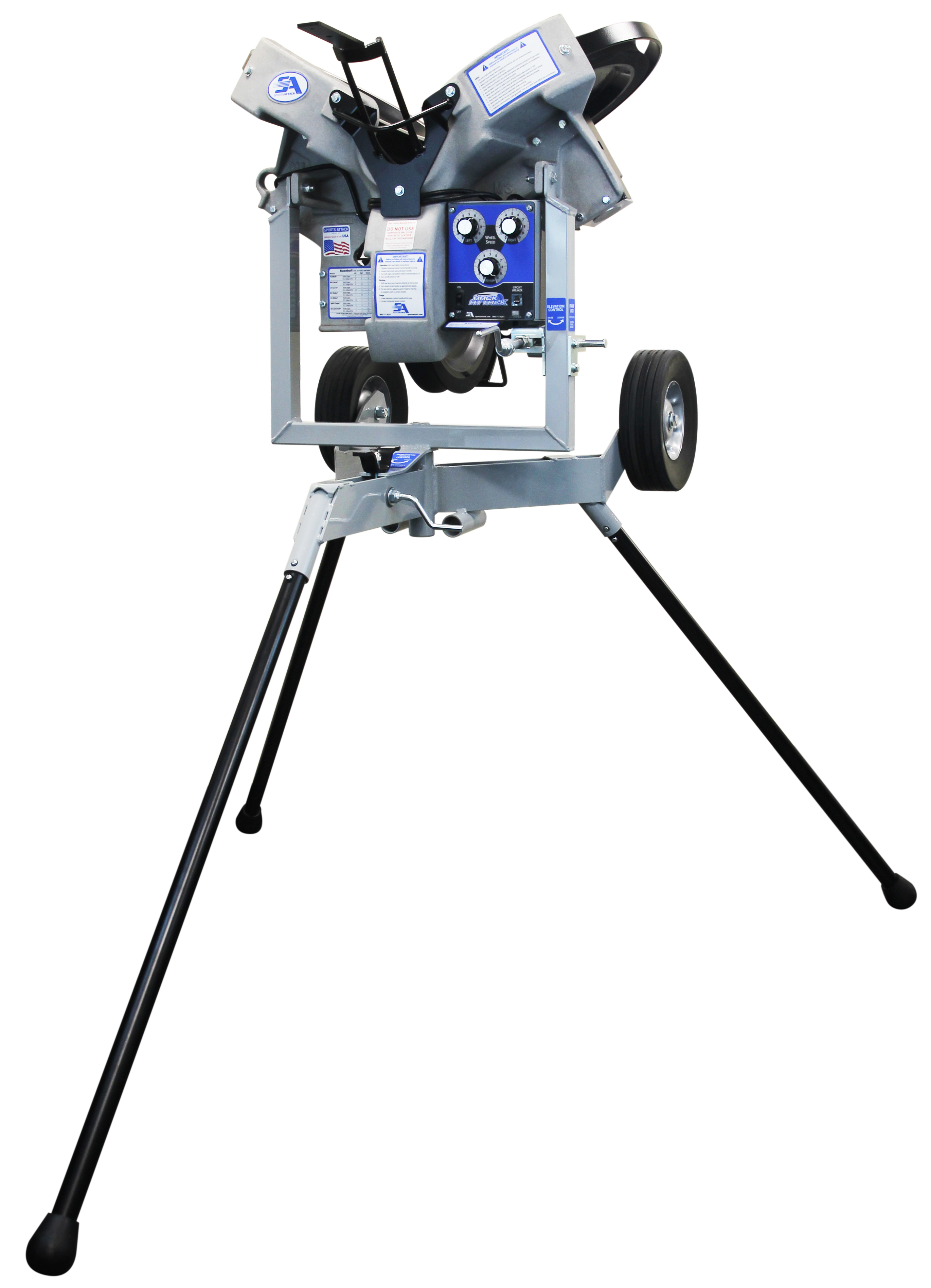 Engineered for durability and mobility, the Hack Attack features a powder-coated steel frame, weather-resistant aluminum throwing head, and long-lasting 14" concave throwing wheels. The heavy-duty tripod base ensures stability during high-velocity pitching, while transport wheels and a tilting frame make it easy to move on and off the field. The machine arrives fully assembled and ready for immediate use.